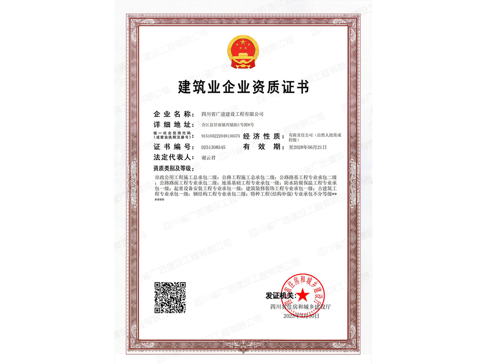 目前,公司建筑工程施工總承包資質已升級為壹級資質,公司有職工280余人,有職稱人員113人(其中高級職稱3人、中級職稱32人、初級職稱78人);各類管理上崗人員40余人;大中專學歷85余人;高中專學歷120余人。企業法人代表兼總經理:謝云君,注冊資金壹億伍仟萬元,下面設有一個分公司“四川省廣進建設工程有限公司赤水分公司”,分公司地址:貴州省遵義市赤水市太平街。